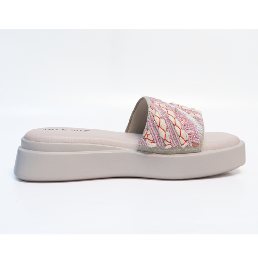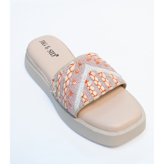 Redefine chic comfort with Jig & Sid’s handcrafted embroidered women’s sliders. Featuring intricate geometric embroidery in peach, ivory, and soft pastel shades, these sliders bring a modern ethnic-fusion vibe to your look. The square-toe design adds a touch of sophistication, while the cushioned sole ensures day-long ease and support.