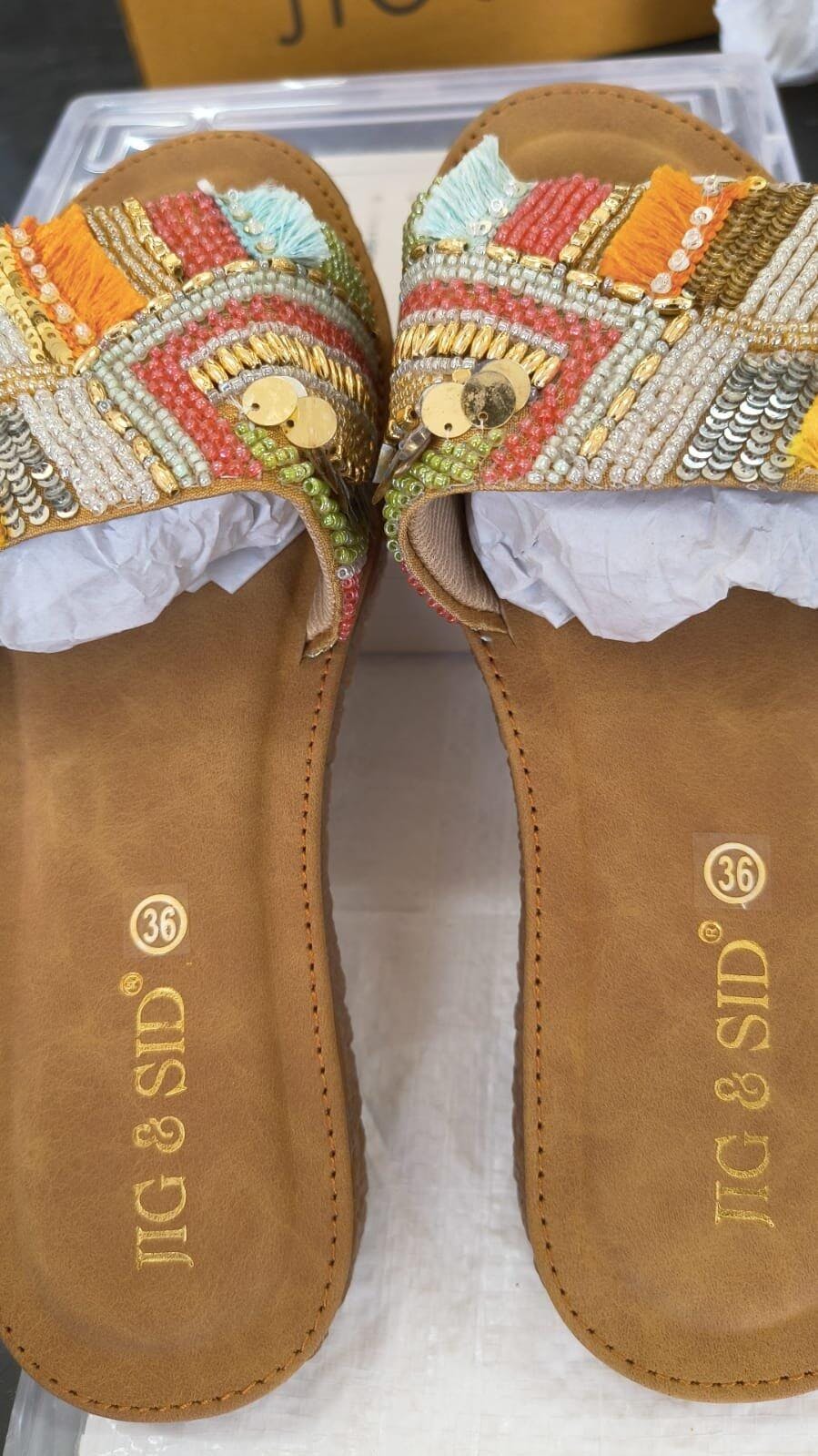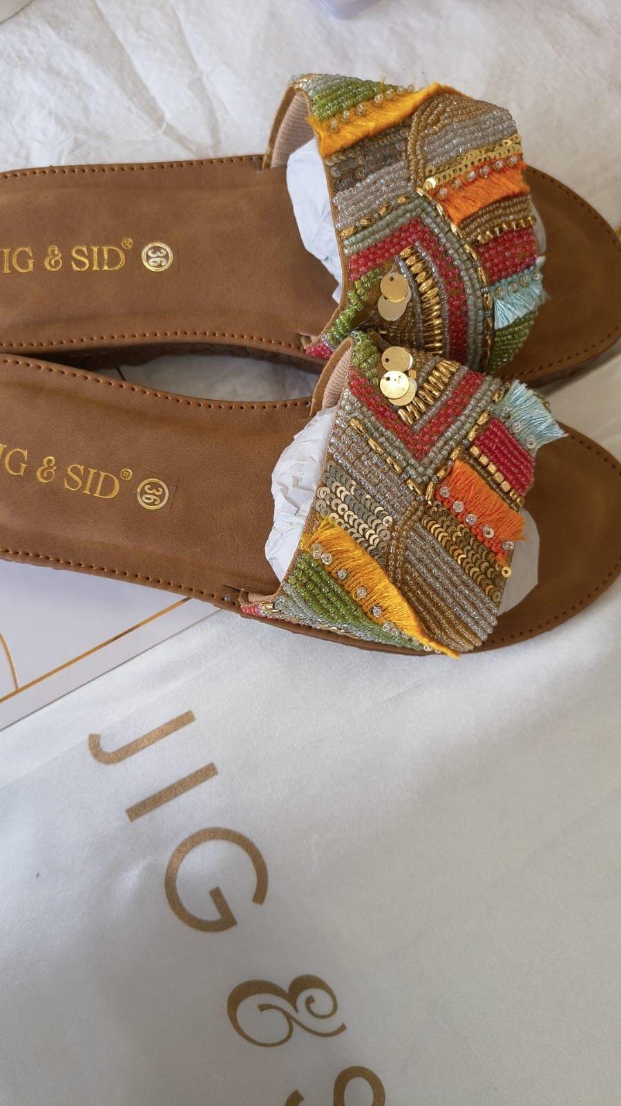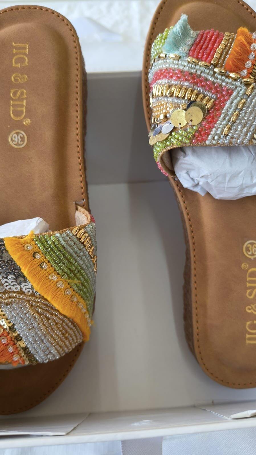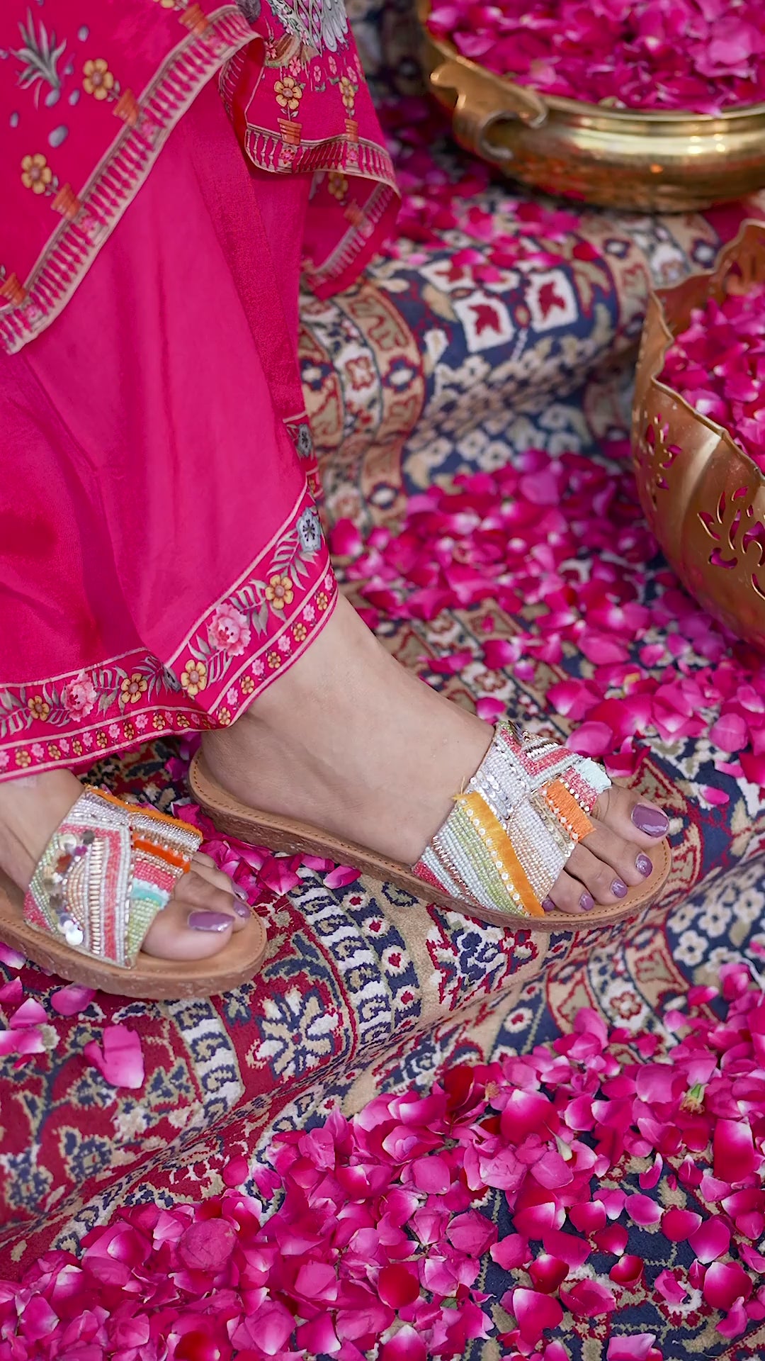 Step into festive elegance with Jig & Sid’s Premium Hand-Embroidered Sliders, designed for women who love refined ethnic fashion without compromising comfort. Crafted on a soft tan cushioned base, these sliders showcase stunning multicolour thread embroidery, pearl embellishments, and intricate beadwork—making them the perfect choice for festive occasions, wedding functions, haldi-mehendi ceremonies, and stylish ethnic outings.