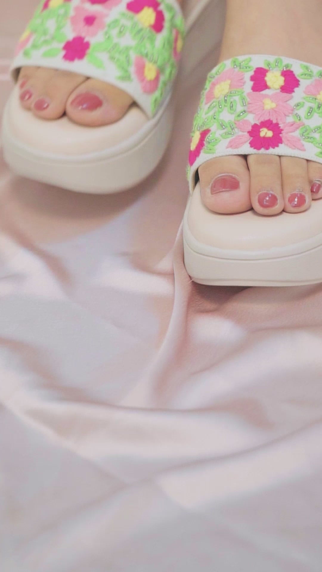 Brighten up your wardrobe with the Jig & Sid Colorful Floral Embroidered Wedge Sandals, designed for women who love vibrant style with all-day comfort. These wedges feature handcrafted embroidery in striking shades of pink, yellow, and green, arranged in blooming floral patterns on a crisp white strap. The design brings a refreshing, youthful charm while staying effortlessly versatile for casual wear and festive occasions.