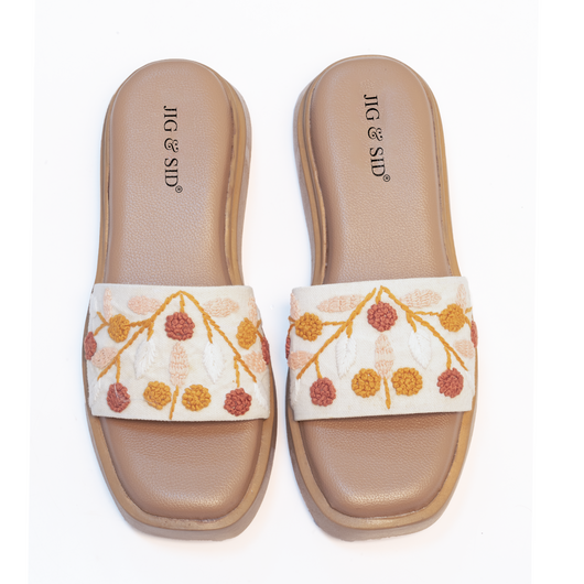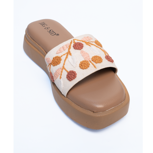 Bring charm and comfort together with the Jig & Sid Floral Embroidered Wedge Sandals, designed for women who love elegance in every step. Featuring hand-embroidered floral motifs in earthy tones, these wedges combine artisanal craftsmanship with modern comfort. The warm shades of rust, mustard, and blush embroidery on a crisp white strap create a fresh, versatile look that pairs beautifully with both casual and ethnic outfits.