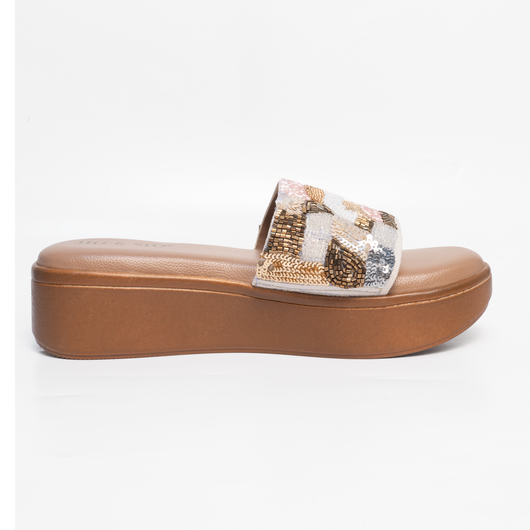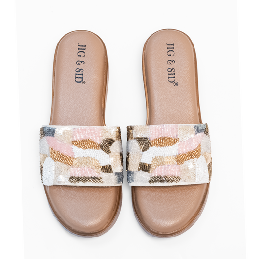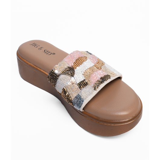 Add sparkle to your step with the Jig & Sid Multicolor Sequin Embroidered Wedge Sandals, a perfect mix of glamour and comfort. Featuring hand-sewn sequins, beads, and thread embroidery in elegant multicolor patterns, these wedges are designed to stand out. The combination of gold, blush pink, white, and metallic tones creates a modern chic look, making them versatile for both festive occasions and casual outings.