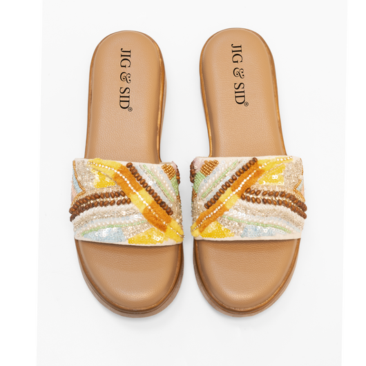 Add vibrance to your step with the Jig & Sid Multicolor Beaded Embroidered Wedge Sandals, a perfect balance of artistry and comfort. Featuring hand-embroidered detailing with colorful beads, sequins, and threadwork, the design creates a lively mix of yellow, brown, green, and pastel tones. The eye-catching embroidery gives these wedges a playful yet elegant appeal, making them suitable for both festive occasions and casual wear.